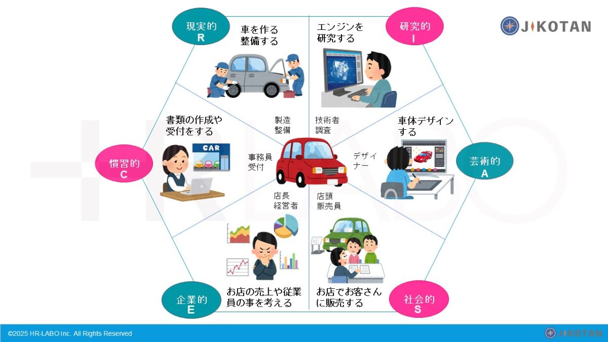 ワークシートを用いながら、自分の興味・価値観・強みを整理しました。興味・関心に関するアンケートでは、30問の質問に自分の直感で点数をつけ、その結果から6つの興味領域(現実的、研究的、芸術的、社会的、企業的、慣習的)の傾向を把握しました。これにより、同じ業界や産業の仕事(例:車に関わる仕事)であっても、「どのような関わり方をしたいのか」という職種レベル(例:車の開発、販売、整備、事務)で考える視点を持つことができました。