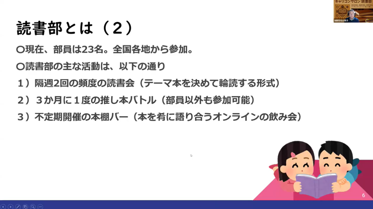 読書部は2024年に関東支部の自主企画として始まり、2025年に正式な部活動へと昇格した発足して間もない部活のひとつです。現在は全国から20名ほどが参加し、隔週でオンライン読書会や「推し本バトル(ビブリオバトル)」「本棚バー」など、多様な形式で“本を通じた学び合い”を実施しています。