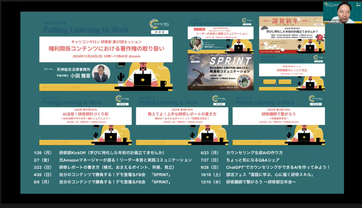 あわせて、キャリアコンサルタントと企業をつなぐ独自の仕組み「キャリコンネット」の紹介も行い、個人の学びにとどまらず、社会への価値提供を目指すキャリコンサロンの取り組みを共有しました。