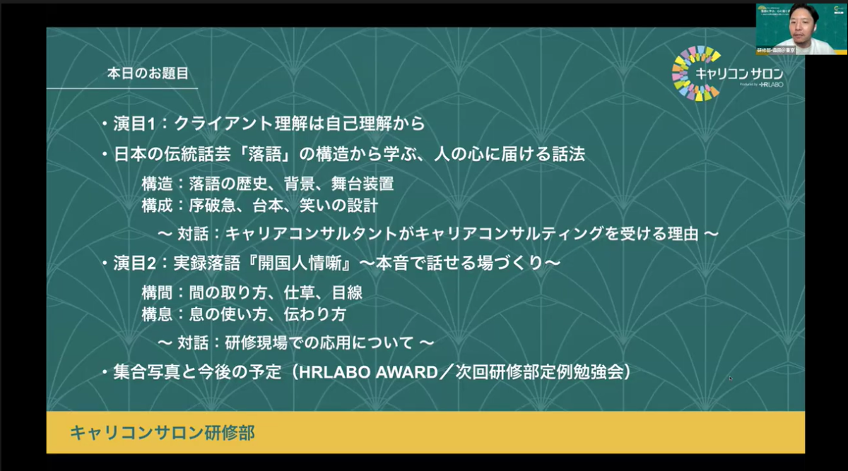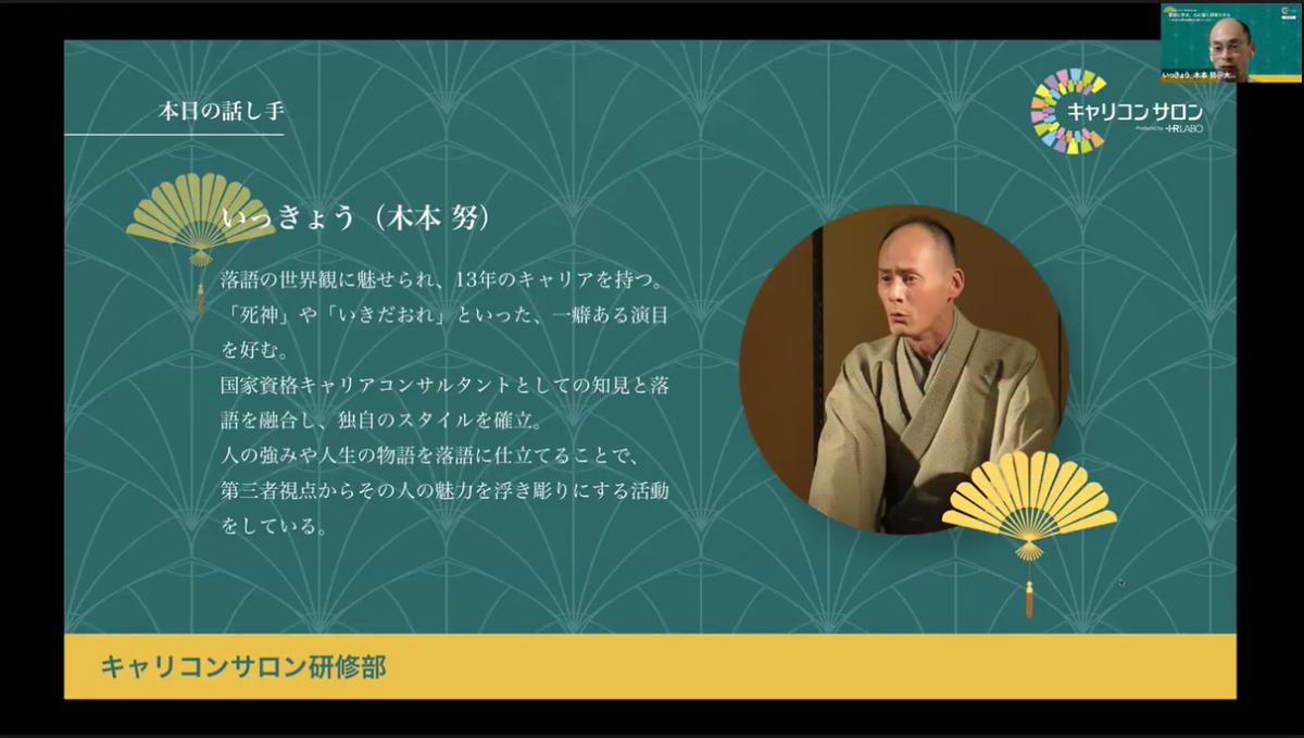 今回のイベントでは、キャリコンであり落語家でもあるいっきょうさんより「落語に学ぶ、心に届く研修スキル」をテーマにお話していただきました。