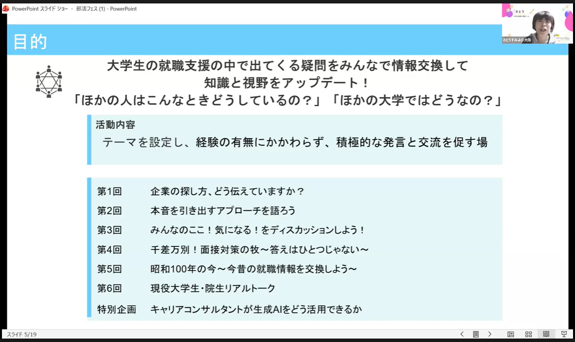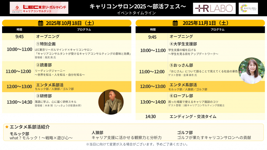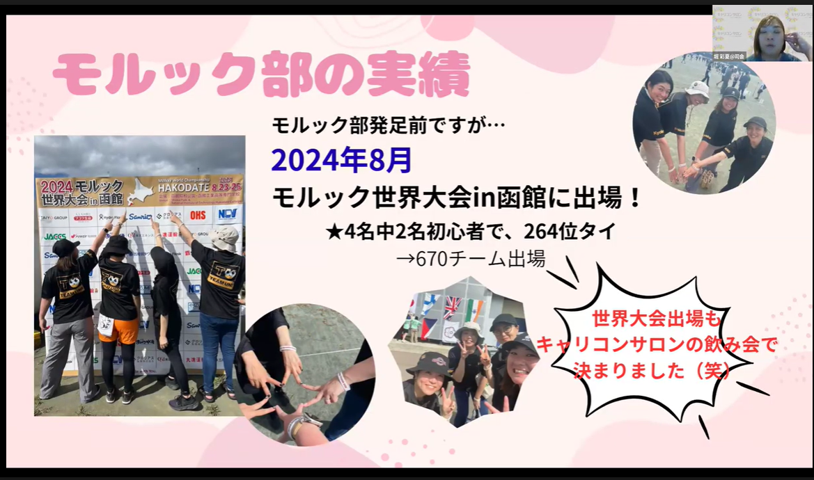 エンタメ系部活のセクションでは、モルック部・人狼部・ゴルフ部がそれぞれの特色ある活動を紹介し、楽しみながらつながりを深められるキャリコンサロンならではの魅力が伝えられました。