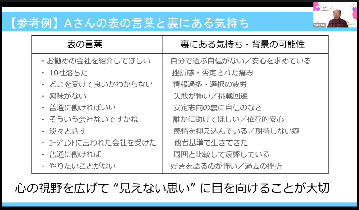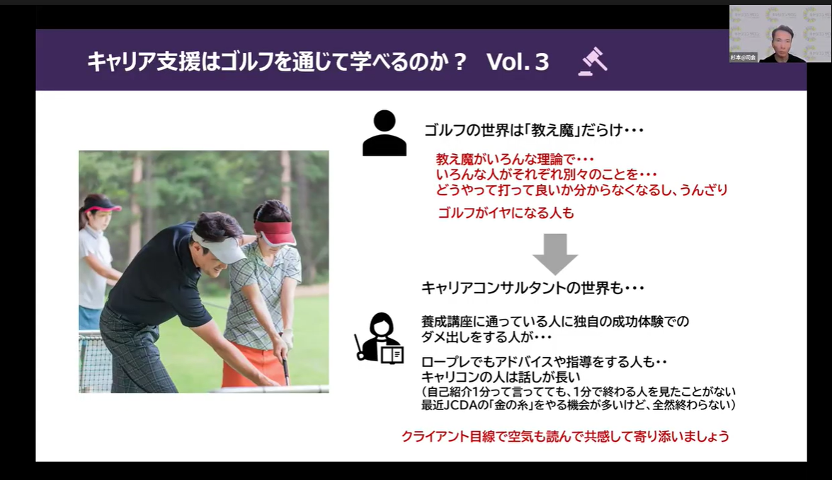 また、講演では、公共施設の相談員、企業内キャリアコンサルタント、資格取得直後の方、育休中の受講者など、さまざまな立場の事例が紹介されました。