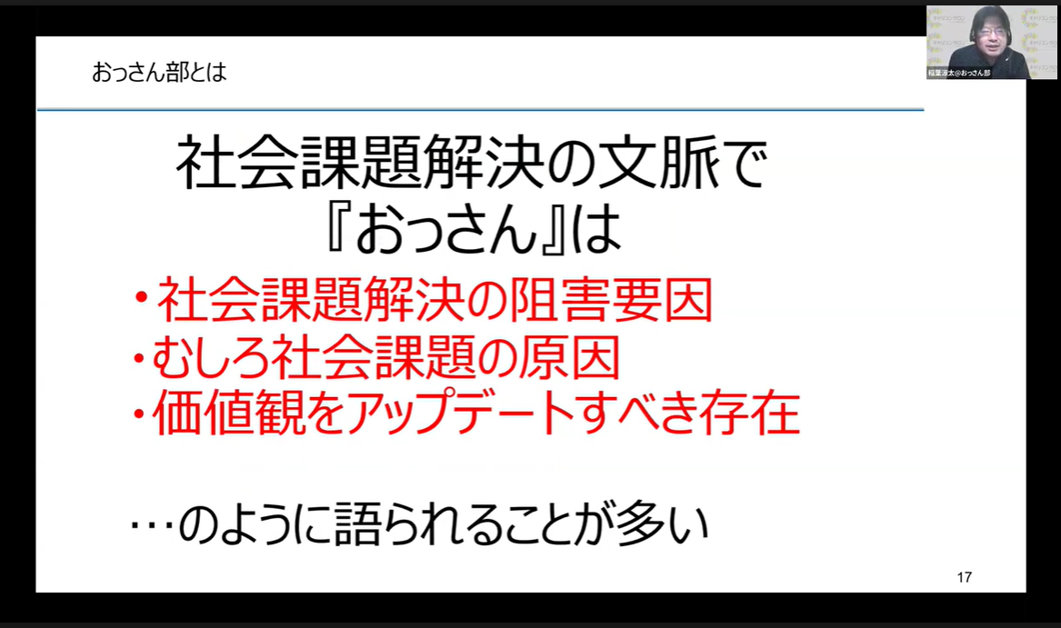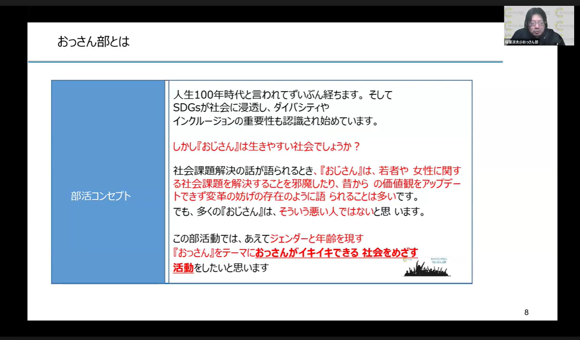 部長の稲葉さんより「おっさんが生き生きと活躍できる社会をつくる」という独自のテーマのもと活動していることが共有されました。