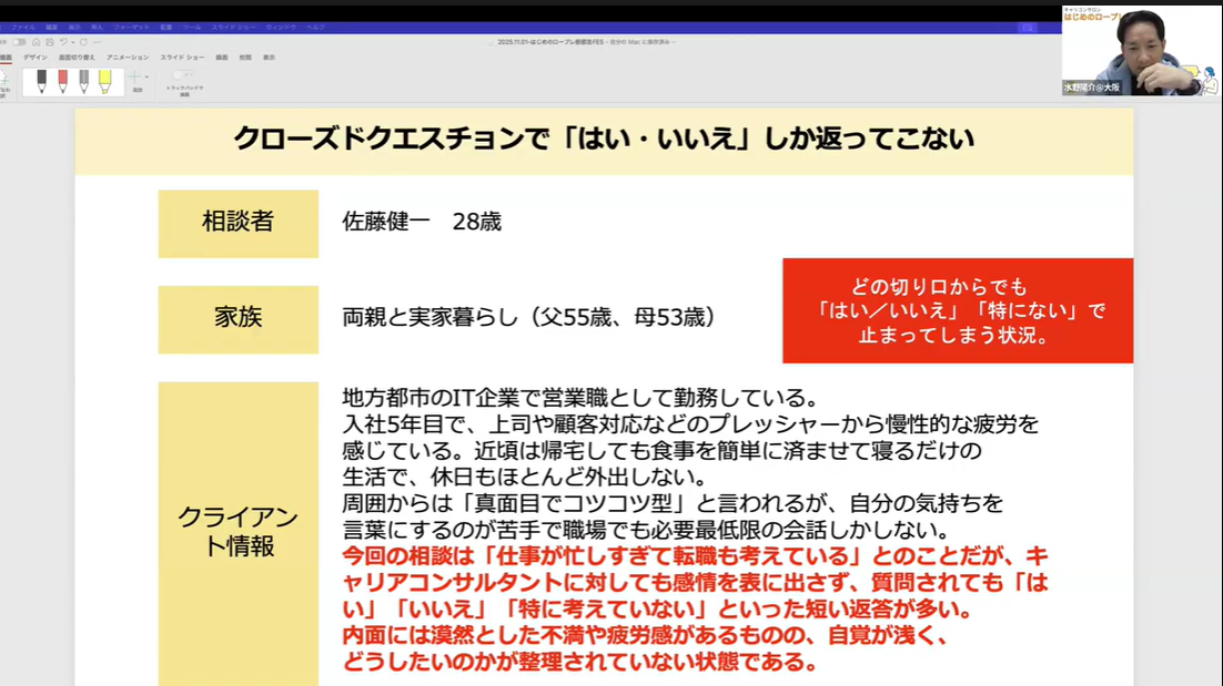 今回のイベントでは「困った場面で使えるキャリア面談のコツ」をテーマに、はい/いいえでしか答えないクライアントをどう支援するかを考えるワークが行われました。