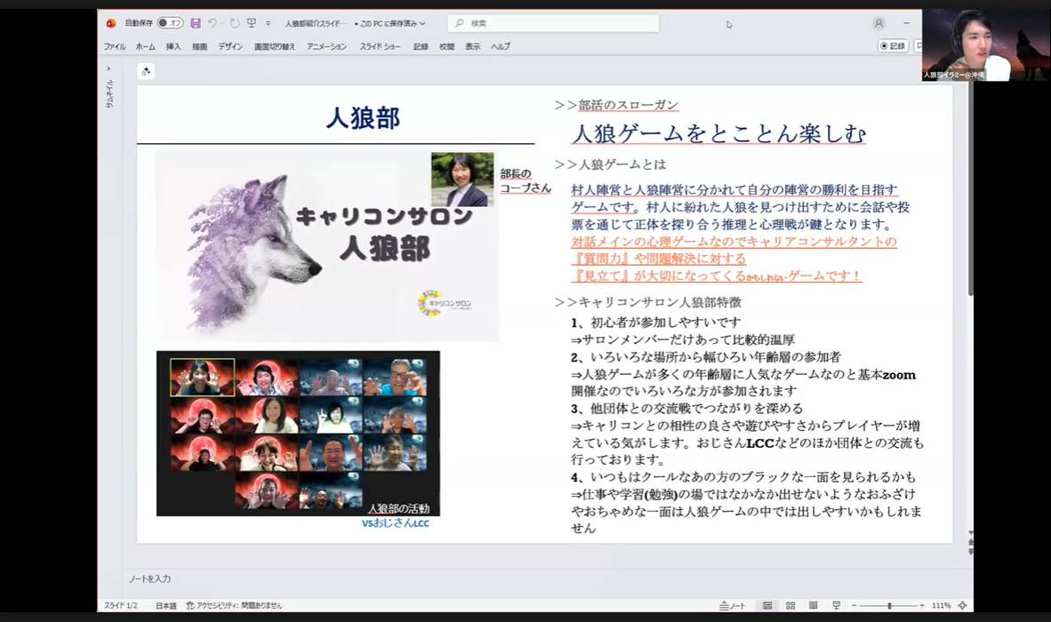 副部長の伊良皆さんが登壇し、「ゲームをとことん楽しむ」を合言葉に、初心者にも優しい場づくりで全国のメンバーと交流している様子が紹介され、実際のワードウルフ体験で会場も盛り上がりました。