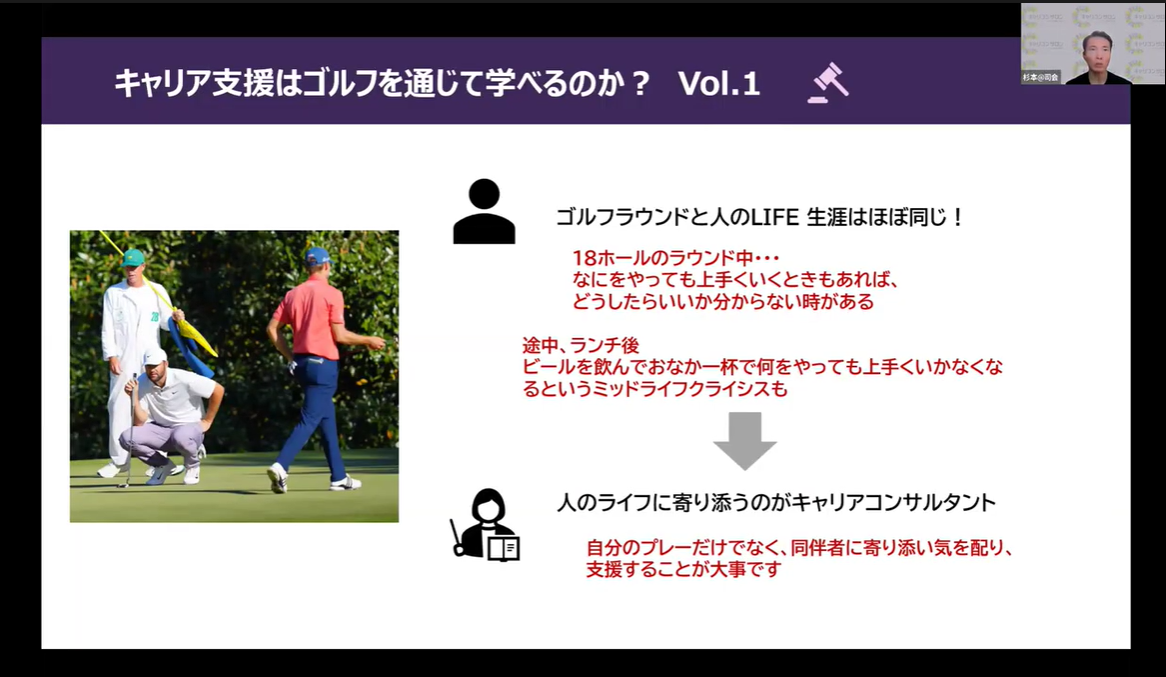 部長の杉本さんより、コンペ開催や他団体との共催の実績が紹介され、ゴルフが“交流と内省の場”として機能することが”ゴルフあるある”を用いてユニークに語られました。