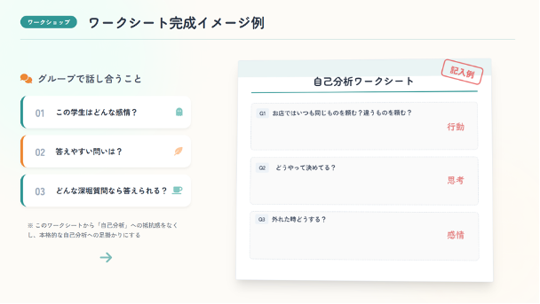 「思い出す」「感じる」「言葉にする」というプロセスに慣れることで、学生は徐々に自分を振り返ることができるようになります。